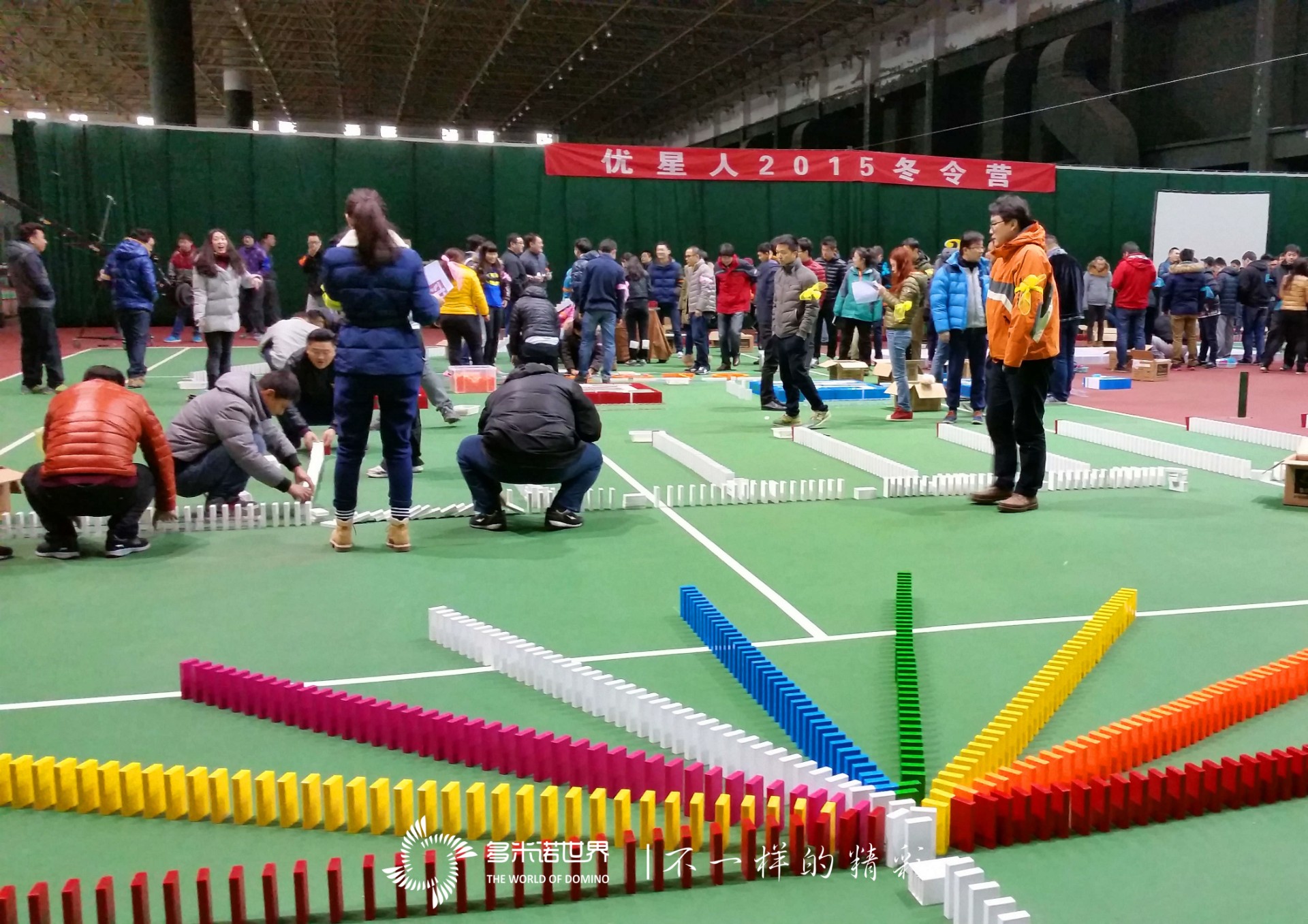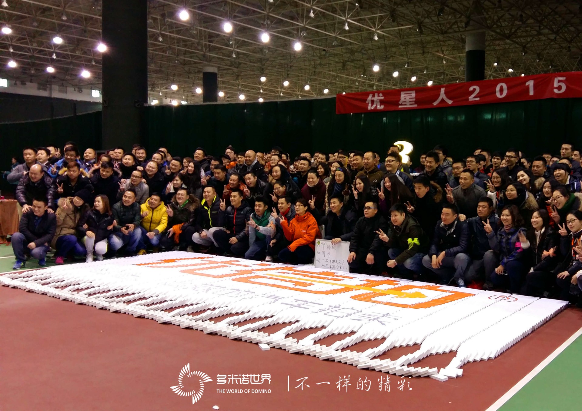 2015年2月7日,來自優(yōu)信拍的240多位中層管理人員在九華山莊參加了“優(yōu)星人2015冬令營”。來自多米諾世界團隊的“多米諾個人世界紀錄”創(chuàng)造者馬立華老師將優(yōu)信拍的企業(yè)文化、發(fā)展歷程、核心價值、旗下品牌等信息全部融入到一幅圖案中,在572平方米的地面上,用50000枚骨牌向參加“優(yōu)信拍2015年年會”的所有中層管理人員展示出了一個別樣的企業(yè)文化。