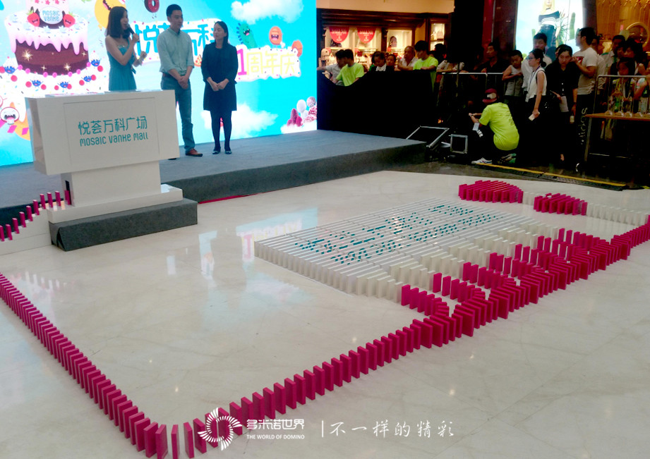 去年的更名儀式現(xiàn)場(chǎng),放飛了近千只蝴蝶,寓意“破繭成蝶、美麗新生”;今年的周年慶典更加別出心裁,特別邀請(qǐng)多米諾世界團(tuán)隊(duì),策劃設(shè)計(jì)了新穎時(shí)尚的多米諾啟動(dòng)儀式,用顧客寫(xiě)滿(mǎn)祝福的骨牌組成愛(ài)心圖案,碼放在悅薈萬(wàn)科LOGO畫(huà)面旁邊,令整幅多米諾圖案幸福感滿(mǎn)溢。