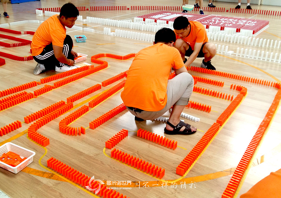 在各隊(duì)隊(duì)長(zhǎng)的帶領(lǐng)下,隊(duì)員們來到了自己的任務(wù)區(qū)域,有條不紊的開始了骨牌碼放工作。有著專業(yè)老師的指導(dǎo),帶著一往無前的熱情,骨牌很快便碼滿了整片場(chǎng)地。當(dāng)大家都在關(guān)注正在做最后連接的幾名隊(duì)員之時(shí),當(dāng)大家都以為翹首以盼的成功馬上就要到來之時(shí),一個(gè)小小的失誤給一幅骨牌圖案帶來了災(zāi)難性地破壞,一枚骨牌的意外倒地,令旁邊的所有骨牌順勢(shì)傾倒。與此同時(shí),場(chǎng)地另一邊連接的隊(duì)員似乎受了干擾,也出現(xiàn)了失誤,現(xiàn)場(chǎng)瞬間凝固……