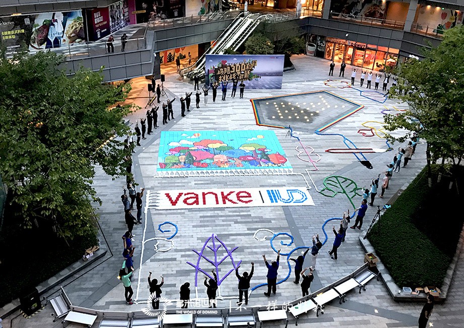 最后,隊(duì)員們組成人浪,圍在多米諾骨牌作品四周,形成了一道特殊的風(fēng)景,既減弱了秋風(fēng)的威力,又為多米諾骨牌表演增添了新意。表演開始,現(xiàn)場音樂聲響起,人浪高低起伏繞場前行一周后,最后一位隊(duì)員啟動(dòng)了骨牌,一幅幅多米諾圖案成功呈現(xiàn)。骨牌在場地內(nèi)穿梭前行,引動(dòng)噴泉噴薄而出。當(dāng)上萬產(chǎn)城LOGO和巨幅熱帶雨林畫面呈現(xiàn)在大家面前,歡呼聲、喝彩聲響徹全場。