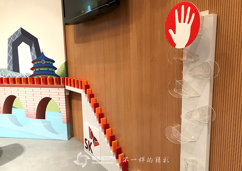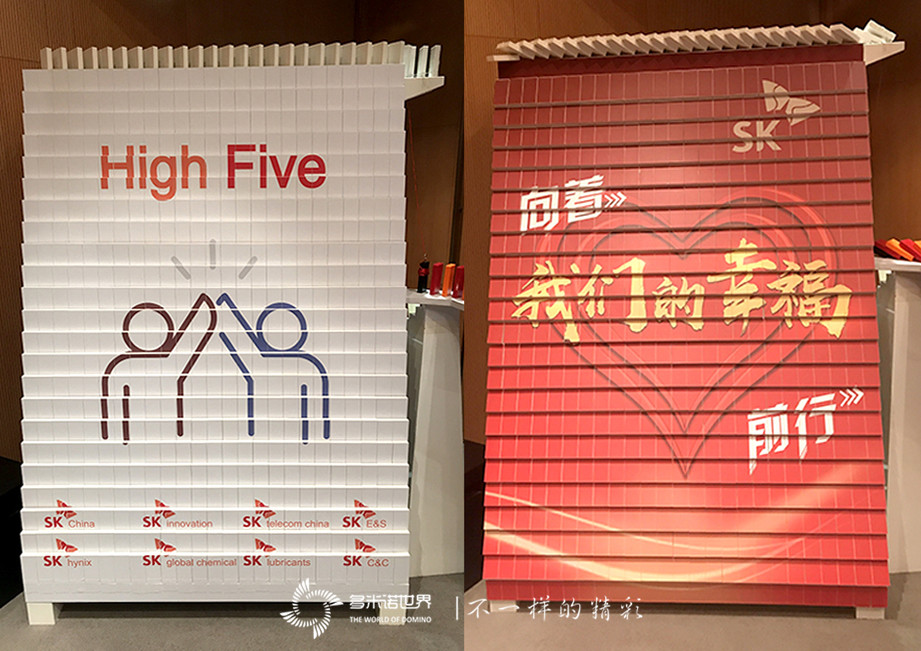 2019年7月5日,韓國SK集團會長,親臨北京SK大廈,進行“幸福TALK”主題演講?;顒蝇F(xiàn)場,多米諾世界團隊設計搭建的多米諾啟動儀式格外引人注目。活動開始,會長高舉手臂,以“HIGH FIVE”的姿勢,拍向手形的啟動裝置,裝置啟動、小球滑下觸及第一枚骨牌后,象征著幸福之路的多米諾骨牌一路前行,直至啟動立體骨牌裝置,一幅“HIGH FIVE”的主題畫面,瞬間變換成“向著我們的幸福前行”的畫面,現(xiàn)場掌聲雷動。精彩、獨特的多米諾啟動儀式拉開了“幸福TALK”演講活動序幕。