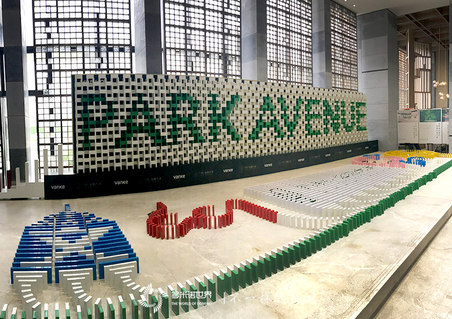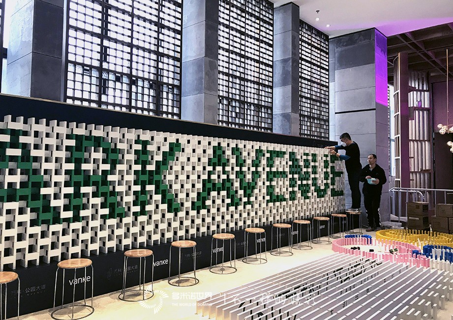 多米諾世界團隊為萬科·公園大道特別設(shè)計的多米諾骨牌墻作品,由5656枚特制多米諾骨牌搭建而成,在骨牌墻前方,還配有展現(xiàn)萬科·公園大道中央生活區(qū)的四幅多米諾圖案及萬科LOGO畫面,經(jīng)過多米諾世界小伙伴48小時的專注搭建,最終完美呈現(xiàn)在大家面前。